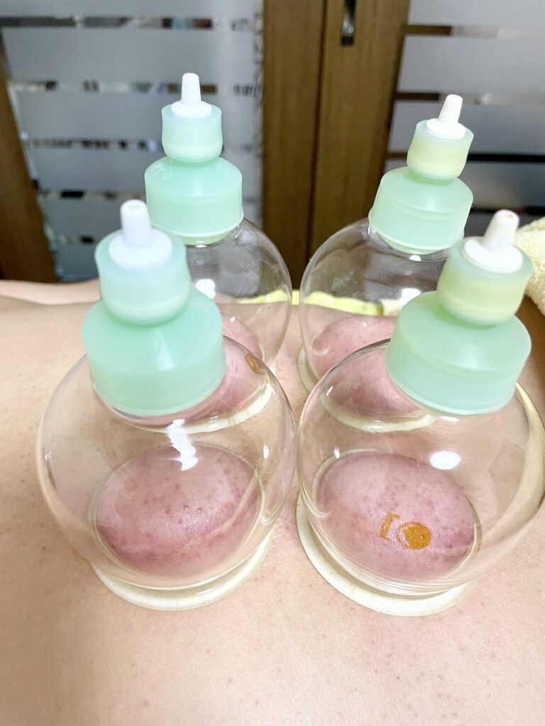 吸い玉(ガラス製のカップ)を肌に吸いつけて、陰圧(引く力)を利用して血行を良くする治療法です。筋肉もほぐれますので、強いコリなどで悩まれている方は一度お試しください。デトックス効果もあります。